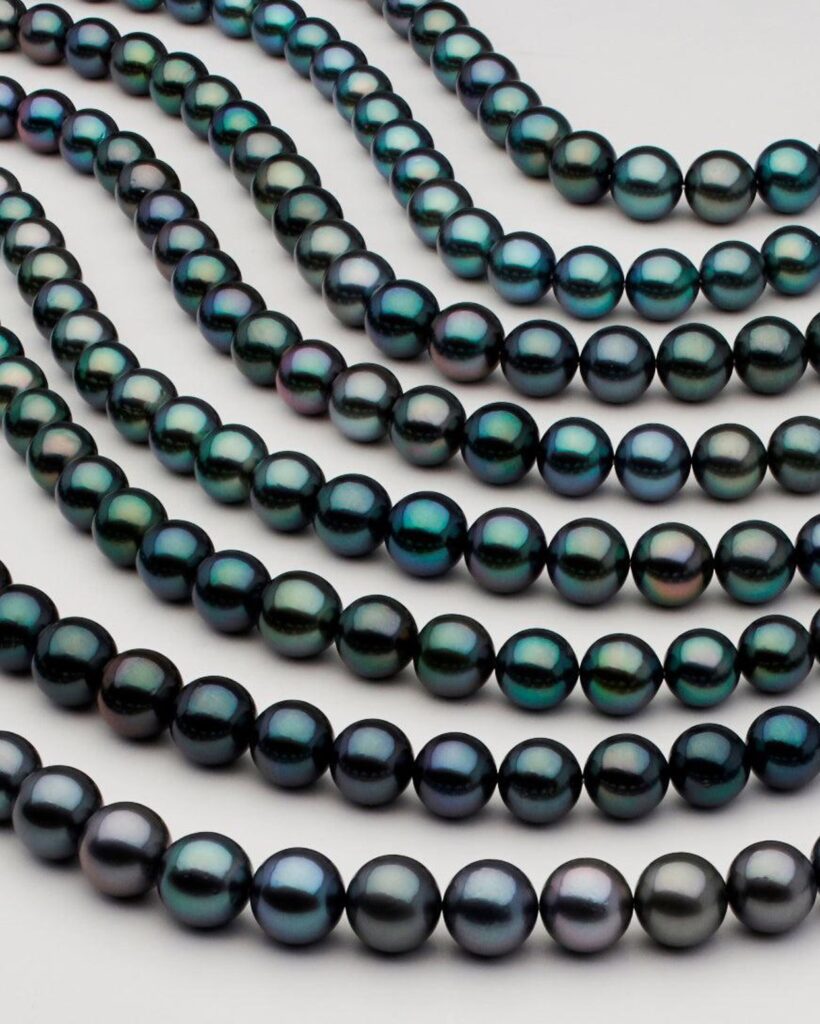 Tahitian pearls are considered to be the second most valuable commercially farmed pearls in the world. Unlike black freshwater and black akoya pearls, which have been irradiated or dyed, Tahitians come by their dark color naturally. Tahitian pearls are bead-nucleated, but unlike akoya pearls, the nacre is typically very thick. The thinnest nacre allowed by French Polynesian law for export is 0.8 mm, which is a depth that would be considered, in the akoya world, extremely thick.