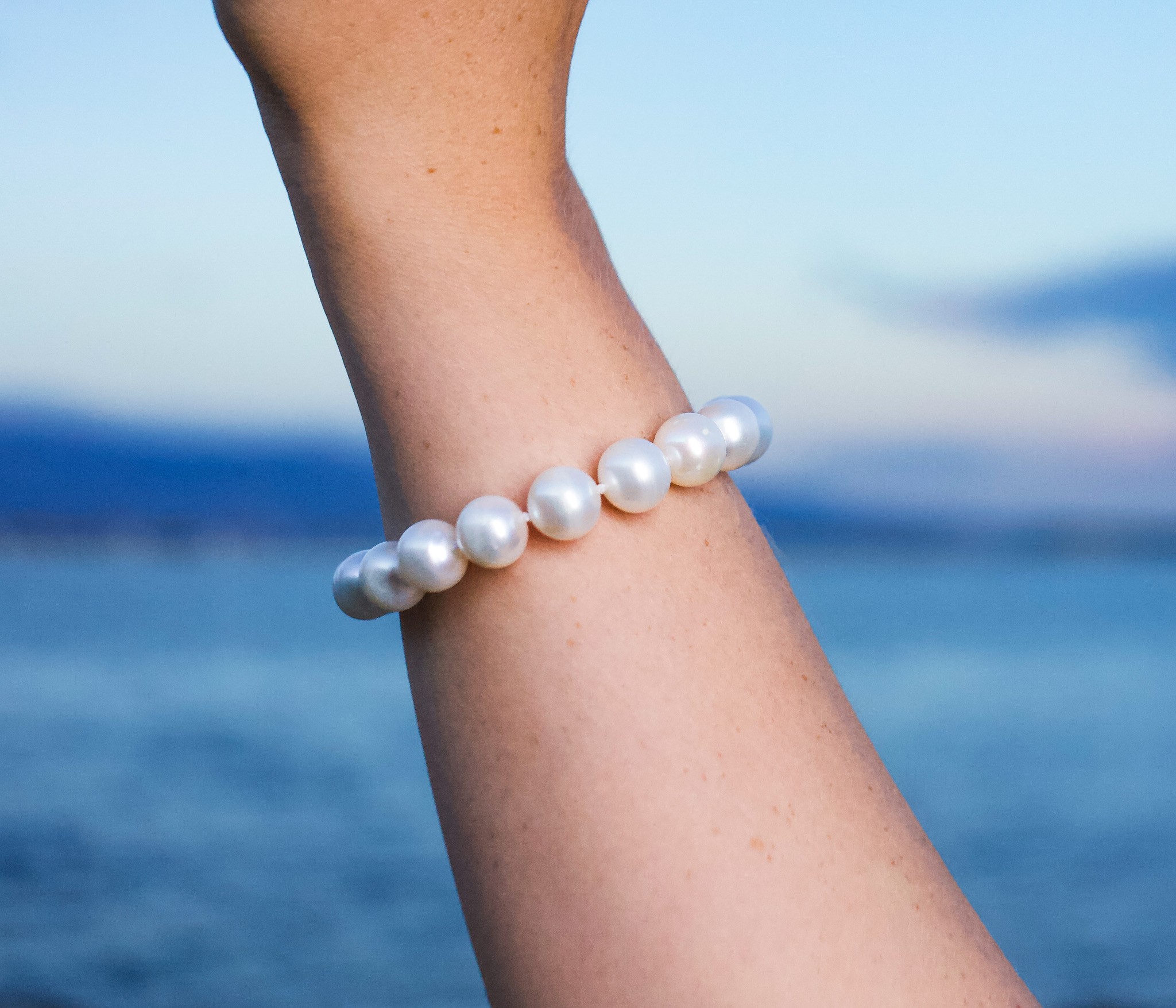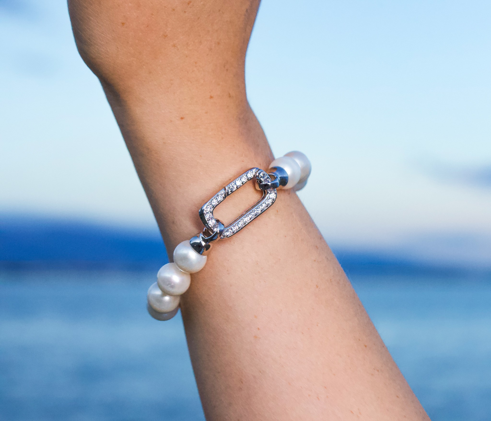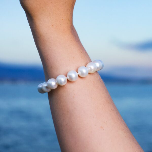 This 10-11mm white freshwater pearl bracelet features lustrous, oversized pearls and is secured with a large, secure silver clasp adorned with sparkling zirconia stones. A perfect blend of elegance and modern sophistication, this bracelet adds a touch of glamour to any special occasion, making it a stunning choice for brides and formal events.