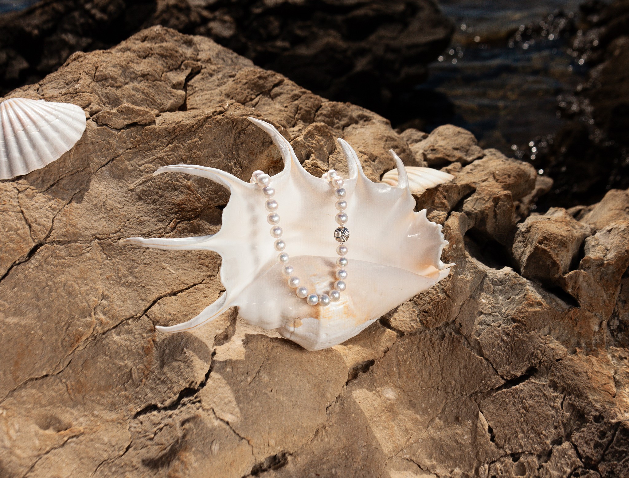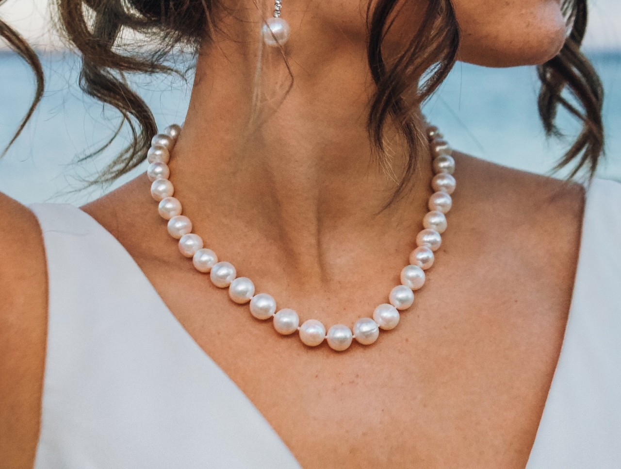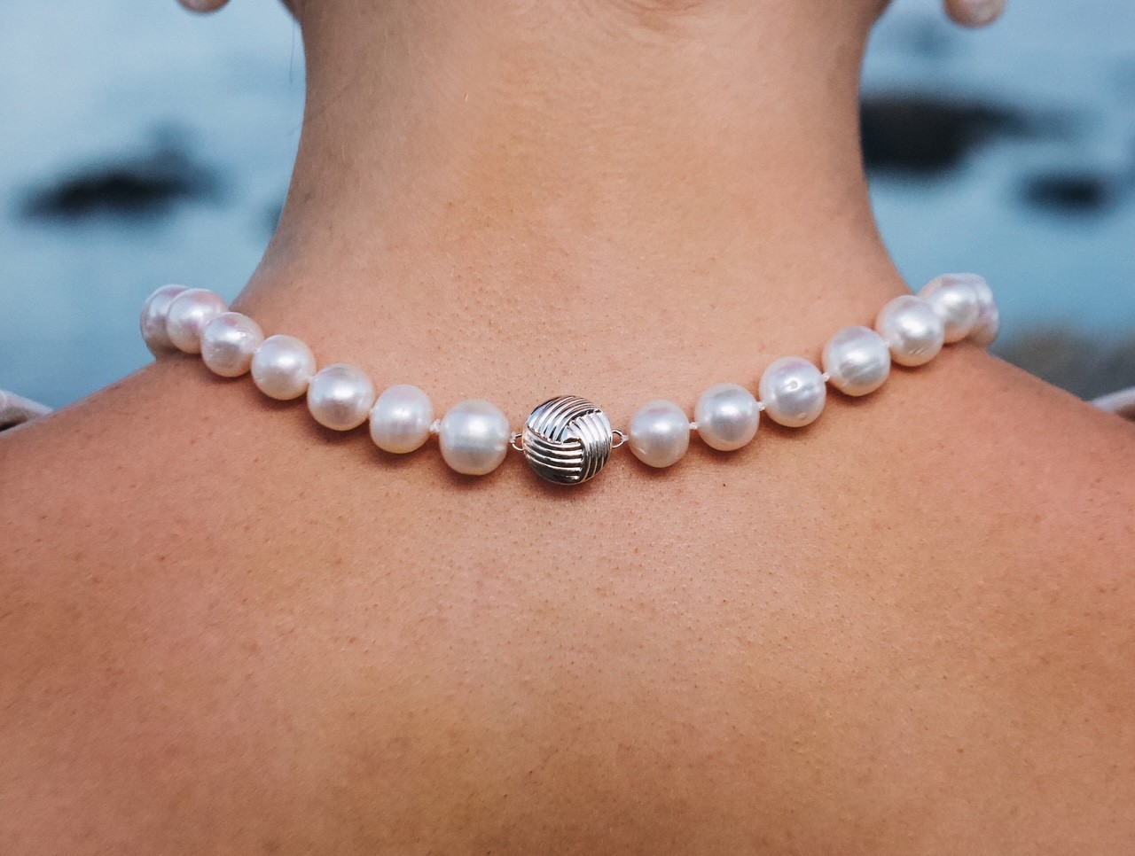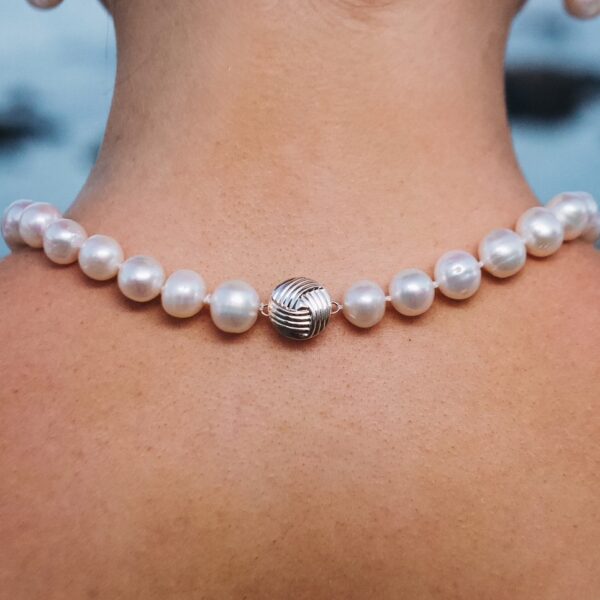 This elegant necklace from our wedding collection features 10–11mm white freshwater pearls, hand-knotted for a classic, luxurious drape. Finished with a stylish sterling silver clasp, it’s the perfect blend of timeless beauty and modern sophistication.