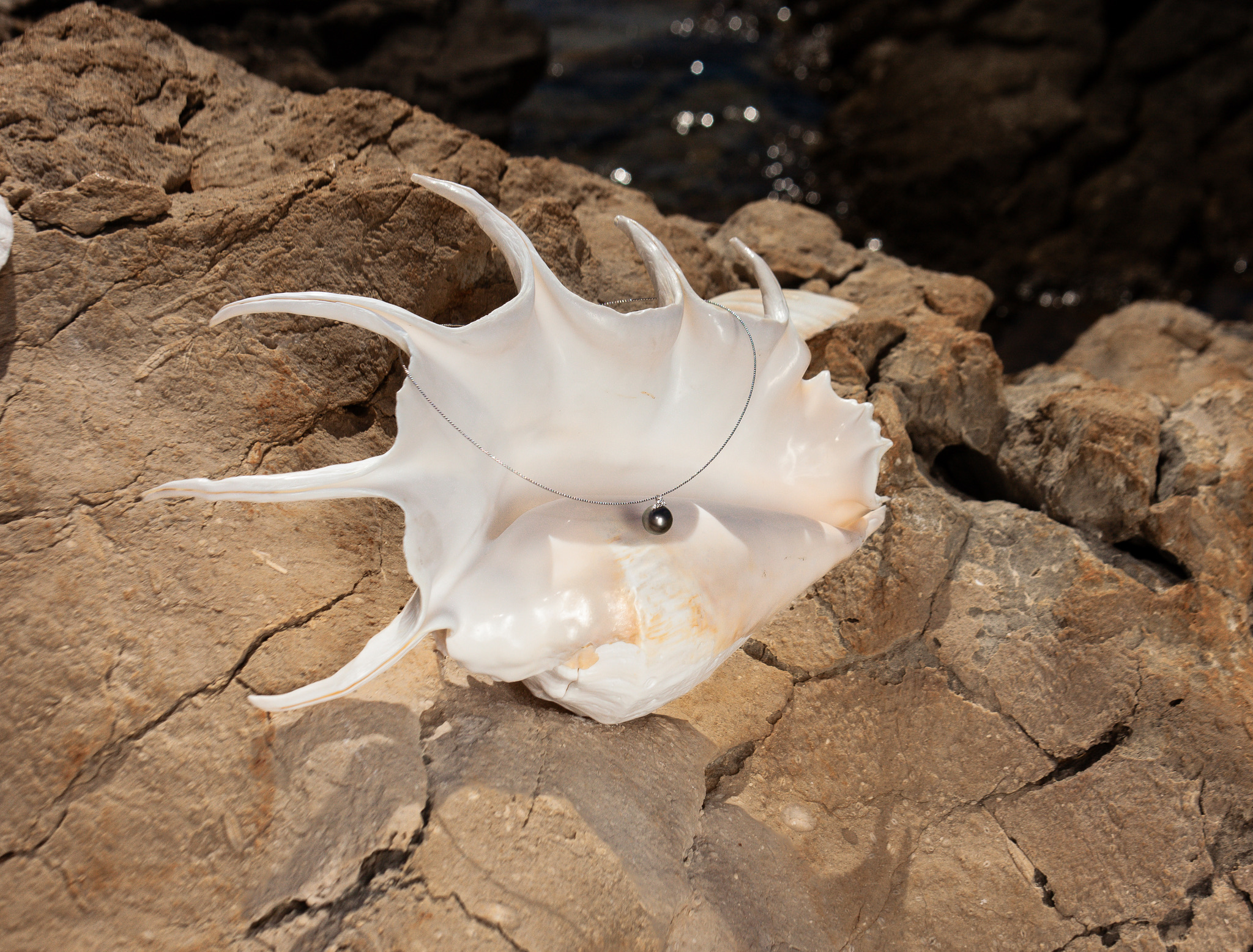 At the heart of the design is a genuine 11mm Tahitian pearl, celebrated for its natural dark body colour and mesmerizing overtones of green, silver, and peacock. Each pearl is hand-selected for its smooth surface, radiant luster, and unique depth of colour — a true treasure from the depths of the ocean.