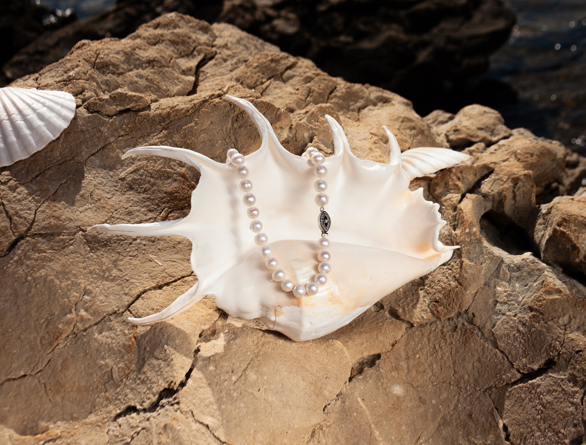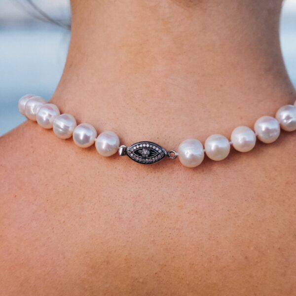 This stunning necklace from our wedding collection features 11–12mm white freshwater pearls, hand-knotted for a luxurious drape. Finished with an elegant Victorian-style sterling silver clasp, it’s a timeless piece perfect for bridal elegance or heirloom charm.
