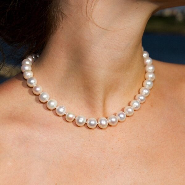 Step into timeless elegance with this exquisite 11–12mm white freshwater pearl necklace, a statement piece from our wedding collection designed to evoke the romance and grandeur of a bygone era. Each pearl is carefully selected for its impressive size, near-round shape, smooth surface, and radiant luster, showcasing the natural beauty and luxury that only high-quality freshwater pearls can offer.