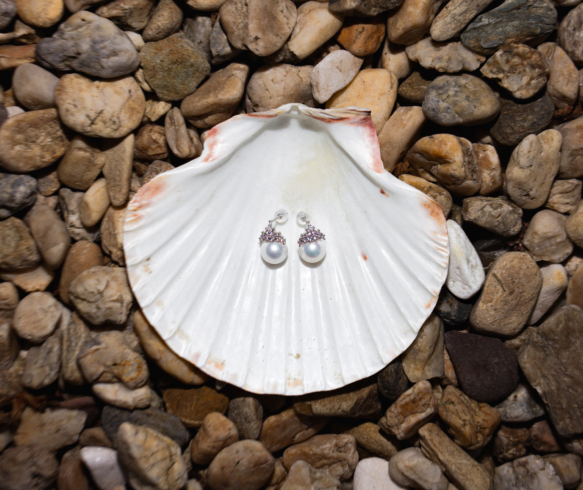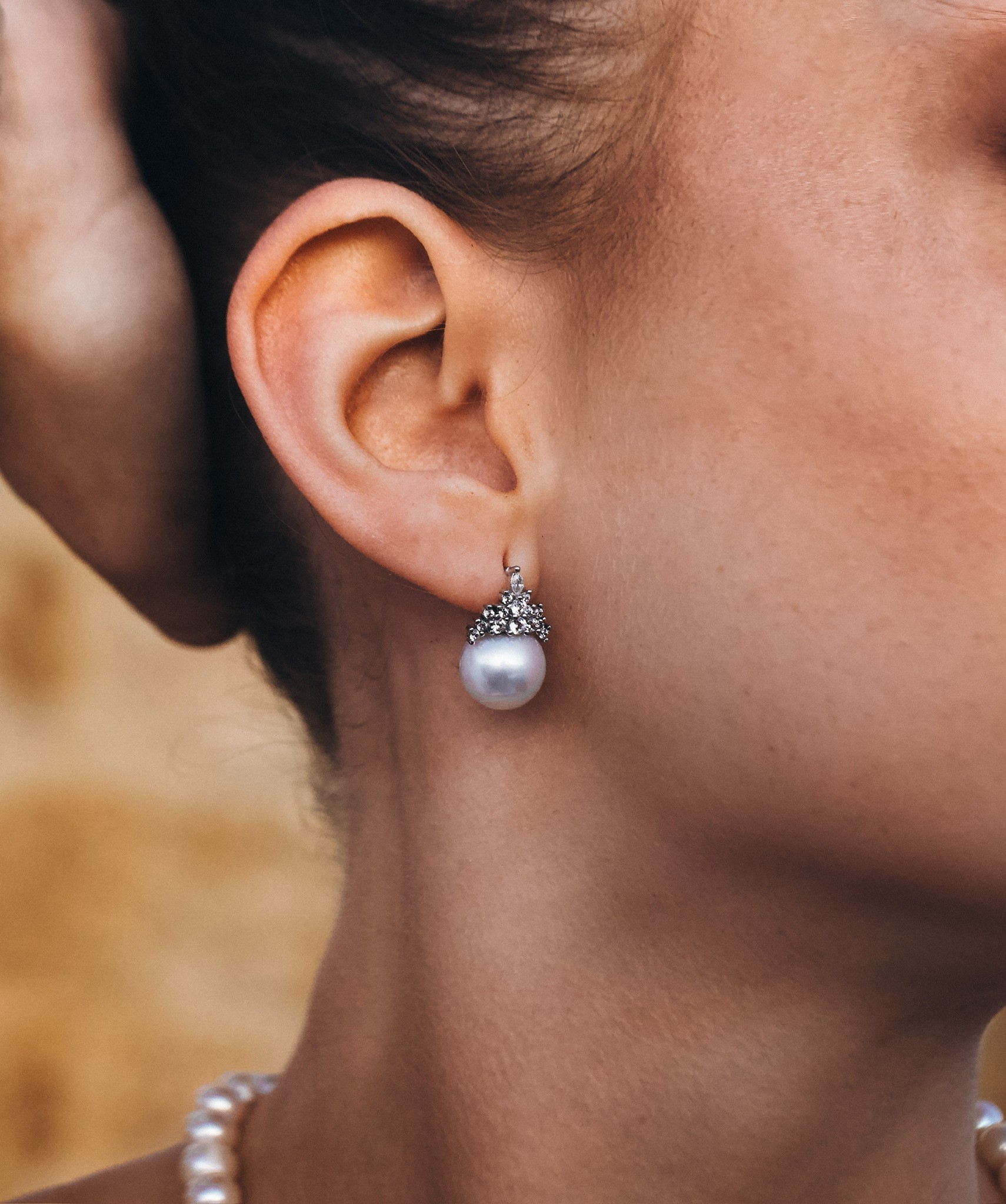 Set in polished 925 sterling silver, each pearl is accented with a delicate arrangement of brilliant-cut zircon stones in a shape of a crown, expertly crafted to mimic the sparkle of fine diamonds. The zircon detailing adds just the right touch of glamour without overpowering the soft, organic beauty of the pearl.