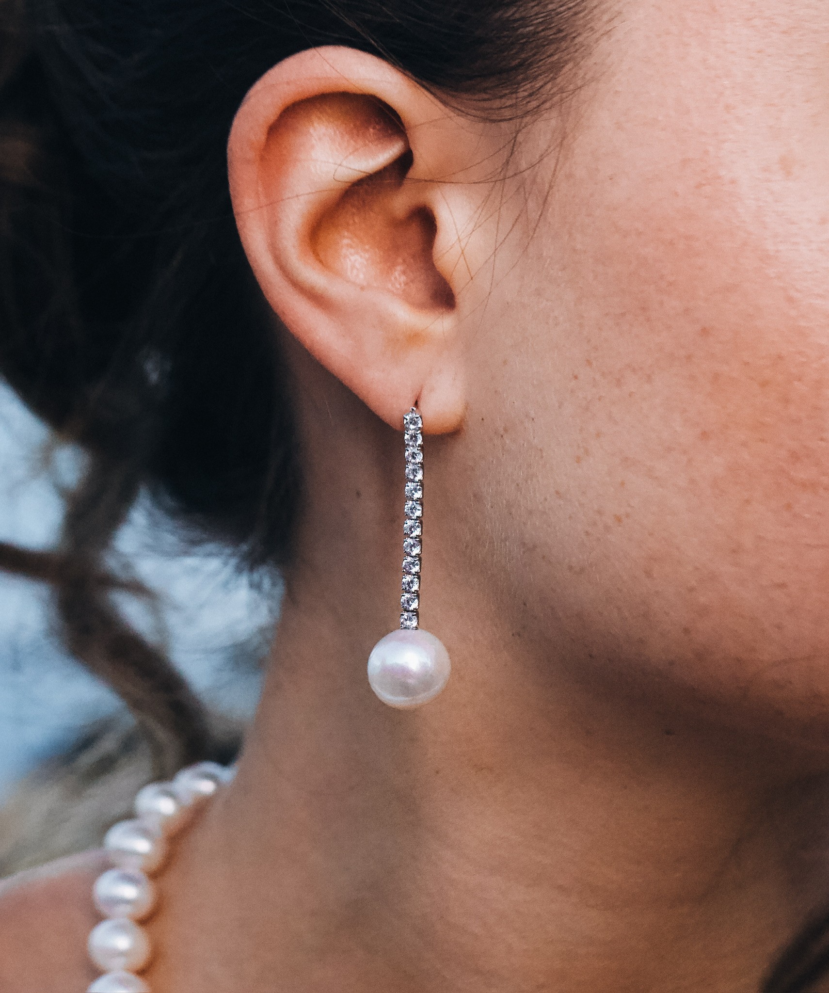 Gracefully elegant and timeless, these 12-13mm White Freshwater Pearl and Zircon Drop Earrings are the embodiment of bridal sophistication. Part of our curated Wedding Collection, they feature a harmonious blend of radiant sparkle and classic charm, perfect for brides, bridesmaids, or any special occasion where elegance is essential.