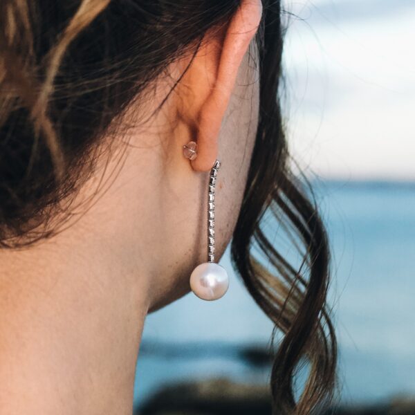 Each earring showcases a luminous white freshwater pearl, hand-selected for its smooth surface, natural iridescence, and generous 12-13mm size — a statement in refined luxury. The pearls are suspended delicately from a sterling silver chain drop, creating fluid movement and drawing the eye with every turn of the head.