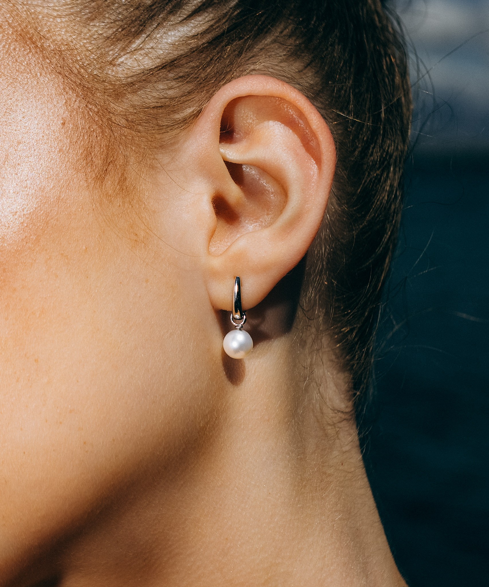 The pearls are gracefully suspended from expertly crafted Italian metalwork, available in sterling silver or 14K gold, known for its delicate detailing and flawless finish. The dangle design offers gentle movement and a graceful silhouette, making these earrings both eye-catching and timeless.