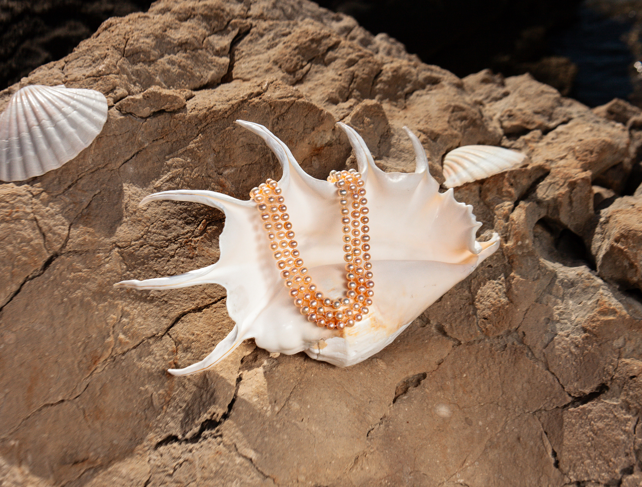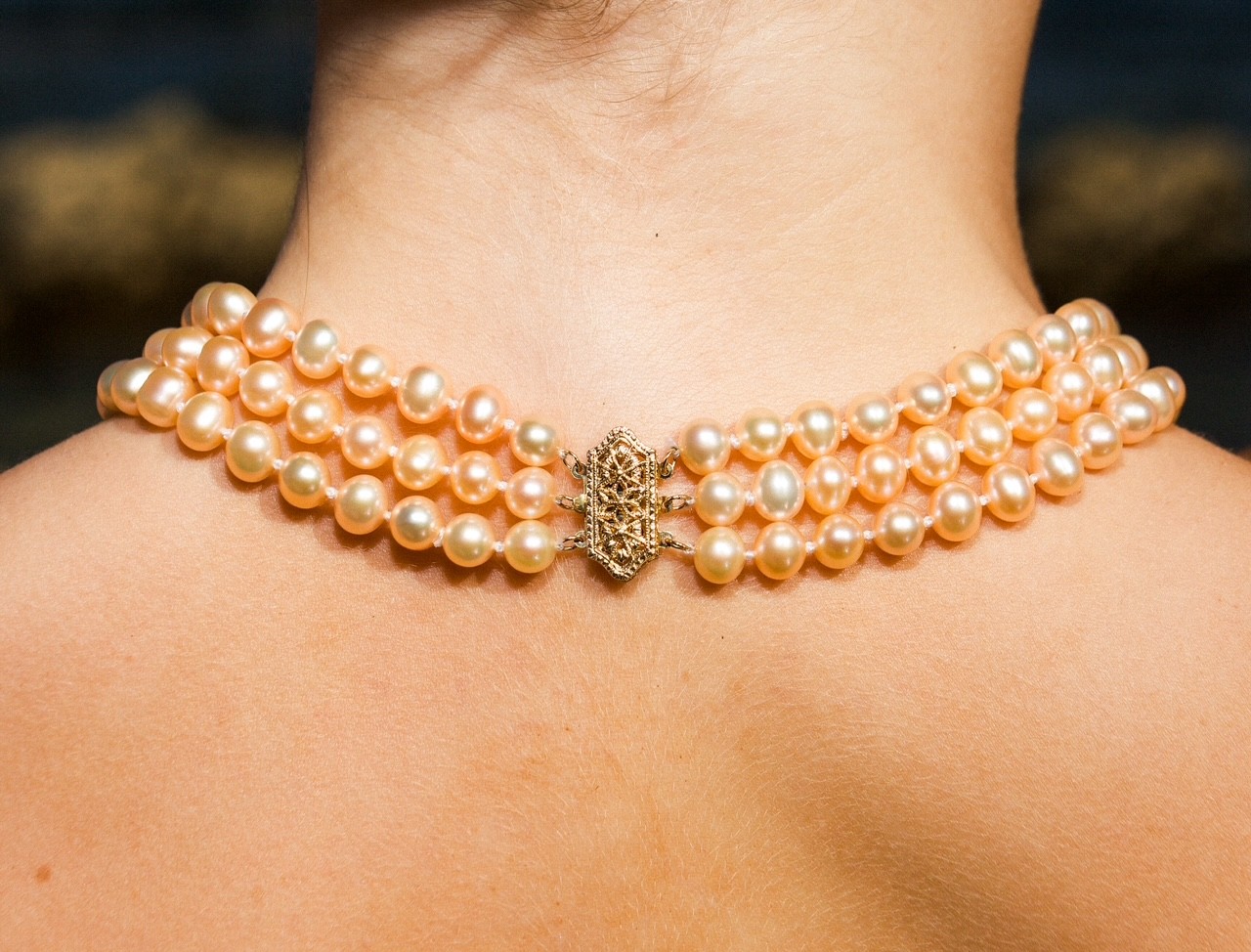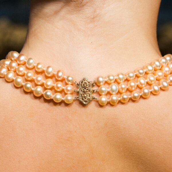 A triple pink-to-peach pearl necklace showcases three strands of lustrous freshwater pearls that gracefully transition in colour from soft pink to warm peach tones. This elegant gradient effect adds depth and charm, making it a timeless statement piece that complements both casual and formal attire
