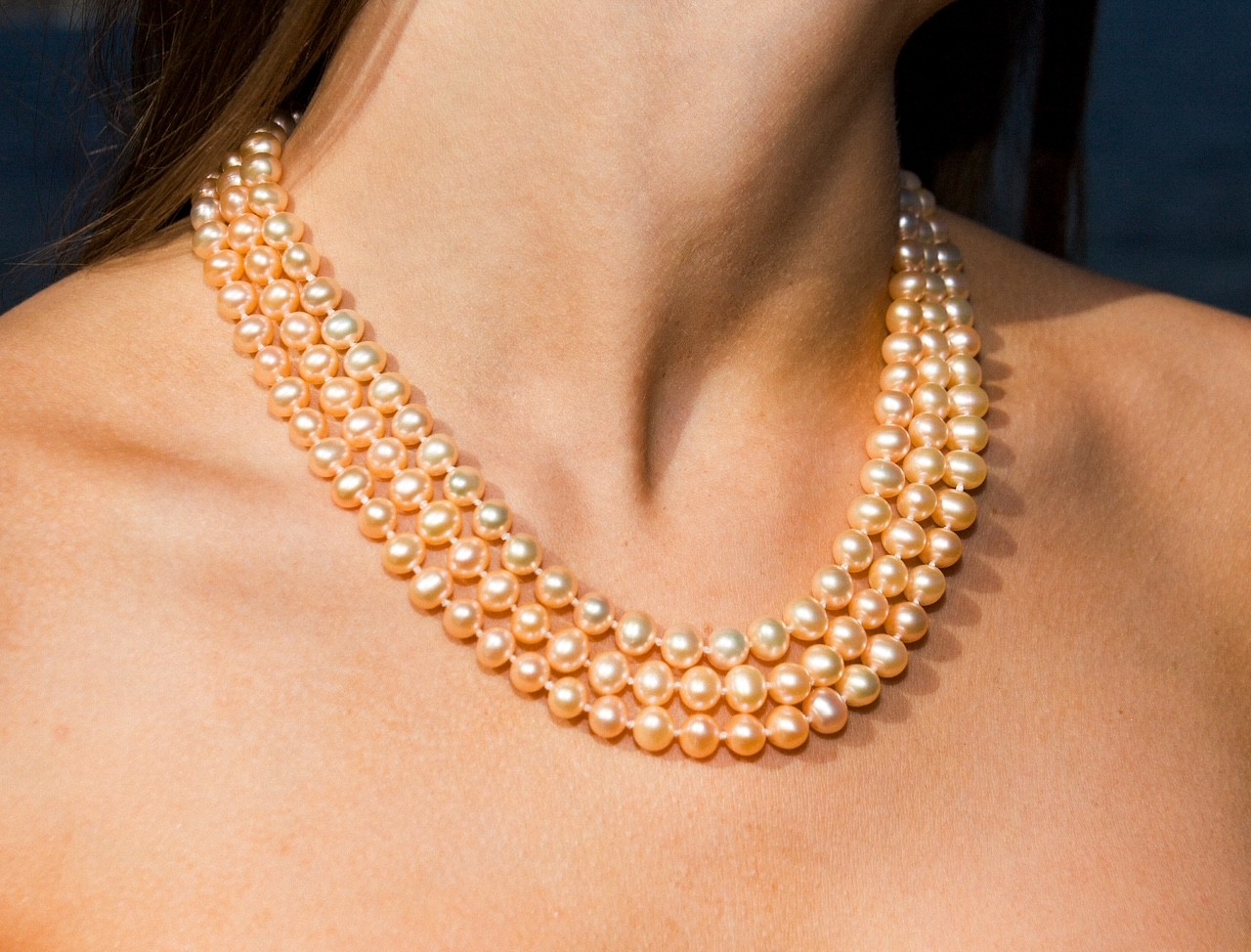 7.5-8mm AA+ Triple – Strand Pink to Peach Freshwater Pearl Necklace