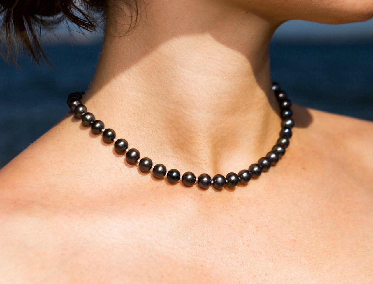 This stunning necklace features a refined strand of 7–8mm black freshwater pearls, each hand-selected for its radiant luster and naturally rich overtones of peacock, aubergine, and midnight green. The pearls are beautifully matched in size and hue, creating a harmonious and elegant drape that flatters the neckline with timeless sophistication.