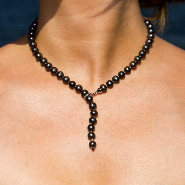 Elegant and timeless, this necklace features 7–8mm black freshwater pearls paired with a 14k gold diamond-accented click clasp. Expertly crafted in Italy, it blends classic luxury with modern sophistication.