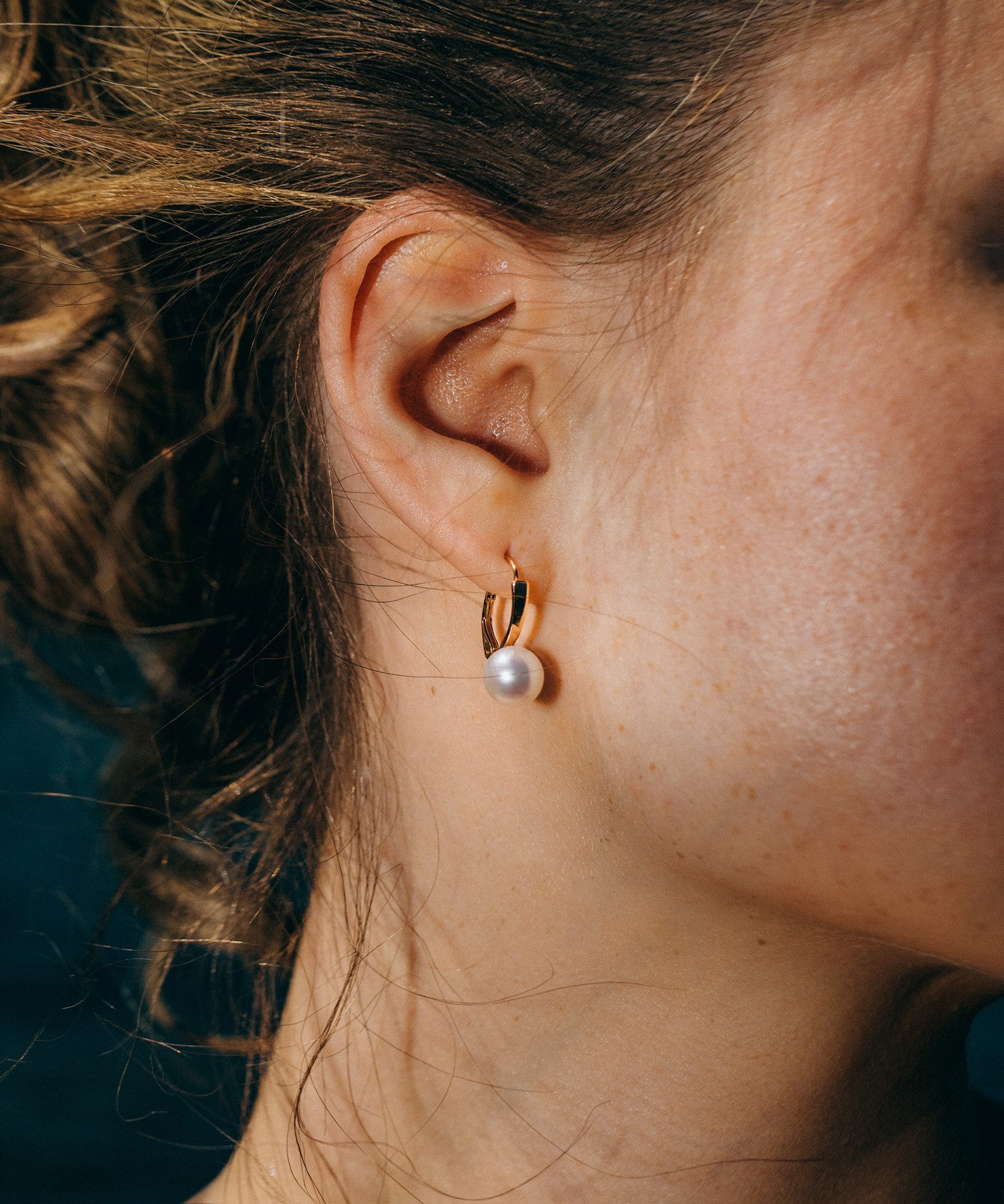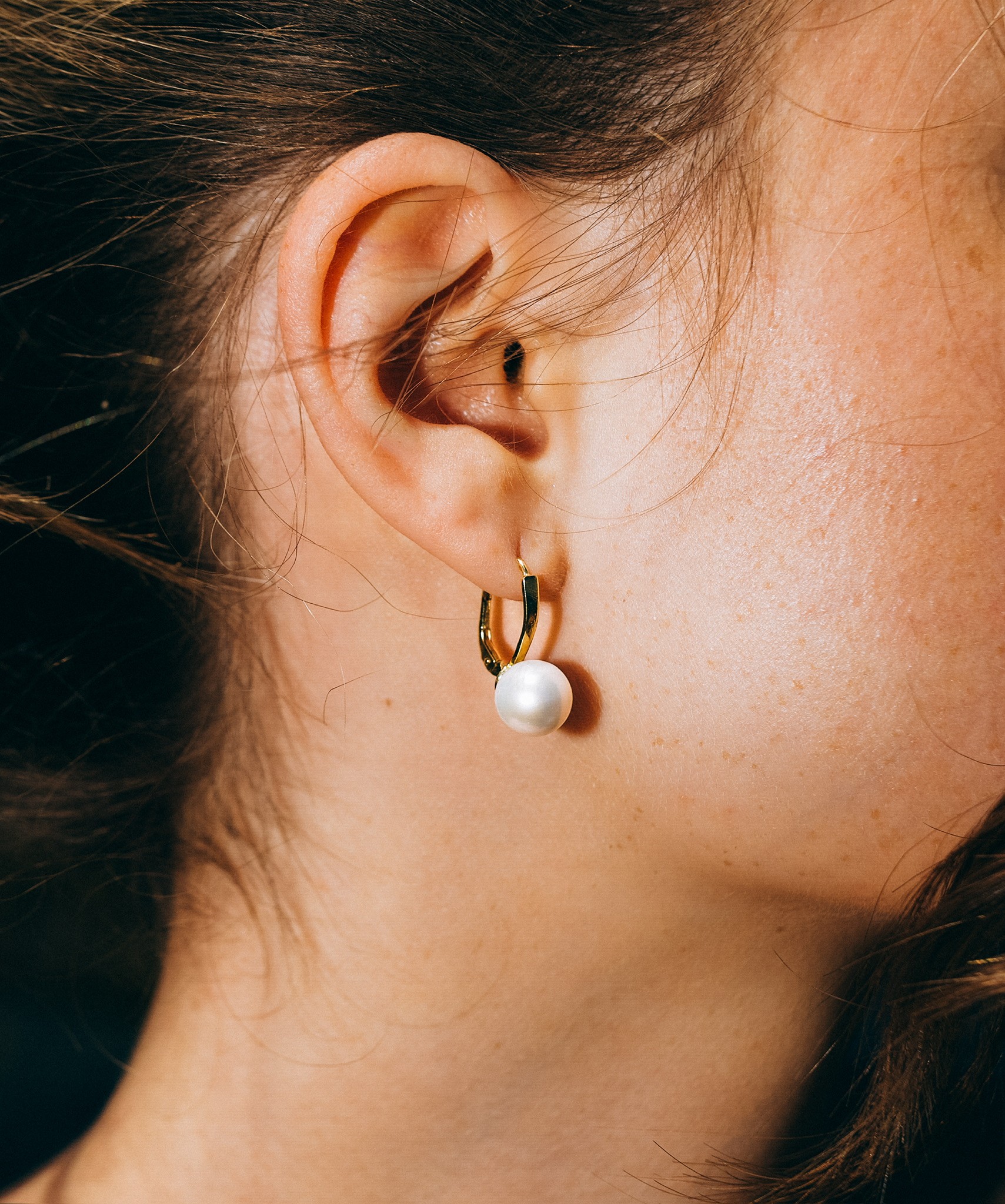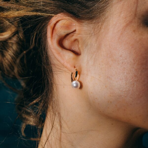 These beautiful white freshwater pearl earrings feature lustrous pearls on gold components, blending timeless elegance with graceful movement for a sophisticated and radiant look.
