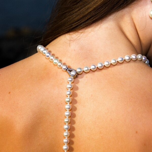 This stunning necklace is a refined blend of elegance and modern sophistication, featuring a delicate strand of 7mm natural white freshwater pearls accented with sparkling diamonds details. The pearls exhibit a soft, lustrous sheen with subtle white and cream undertones, creating a cool-toned palette that enhances any skin tone. Each pearl is carefully matched for size and colour, ensuring a harmonious and graceful drape.