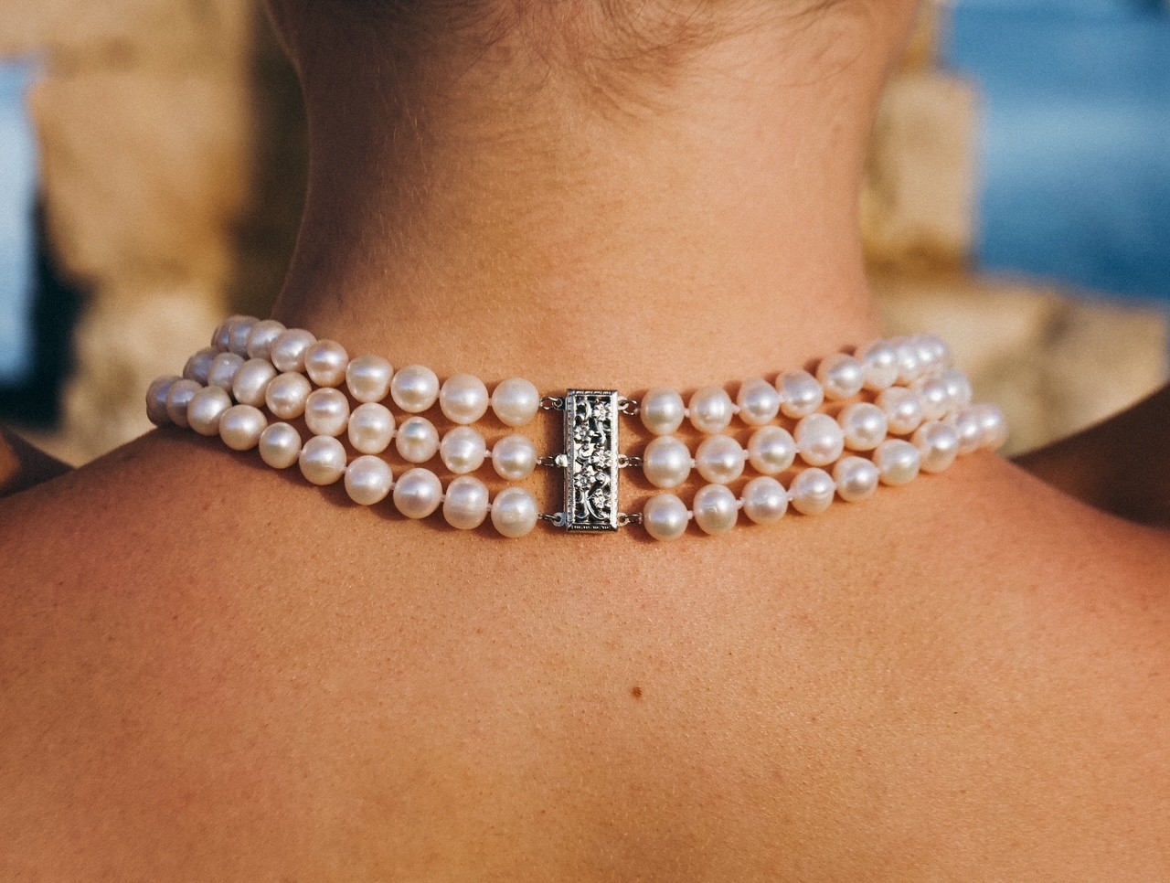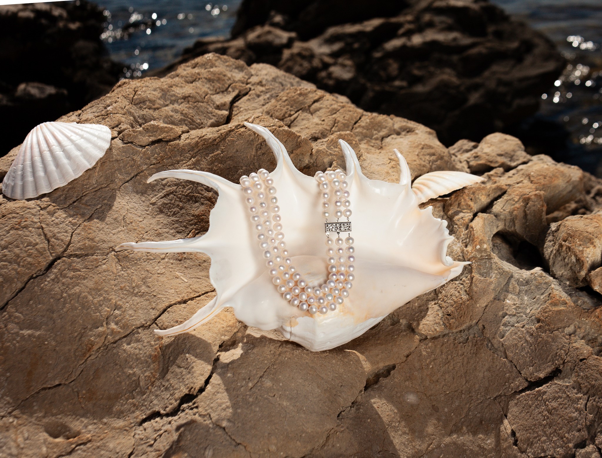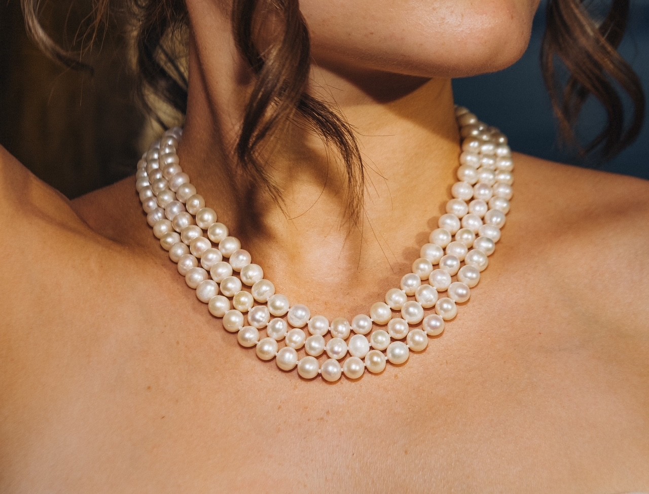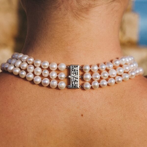 The strands are carefully hand-knotted to ensure durability and a refined drape, while the necklace is finished with a Sterling silver clasp that adds a subtle, elegant touch and provides secure closure. Whether worn as a bridal accessory or to elevate a special occasion outfit, this triple strand pearl necklace is a timeless addition to any jewellery collection.