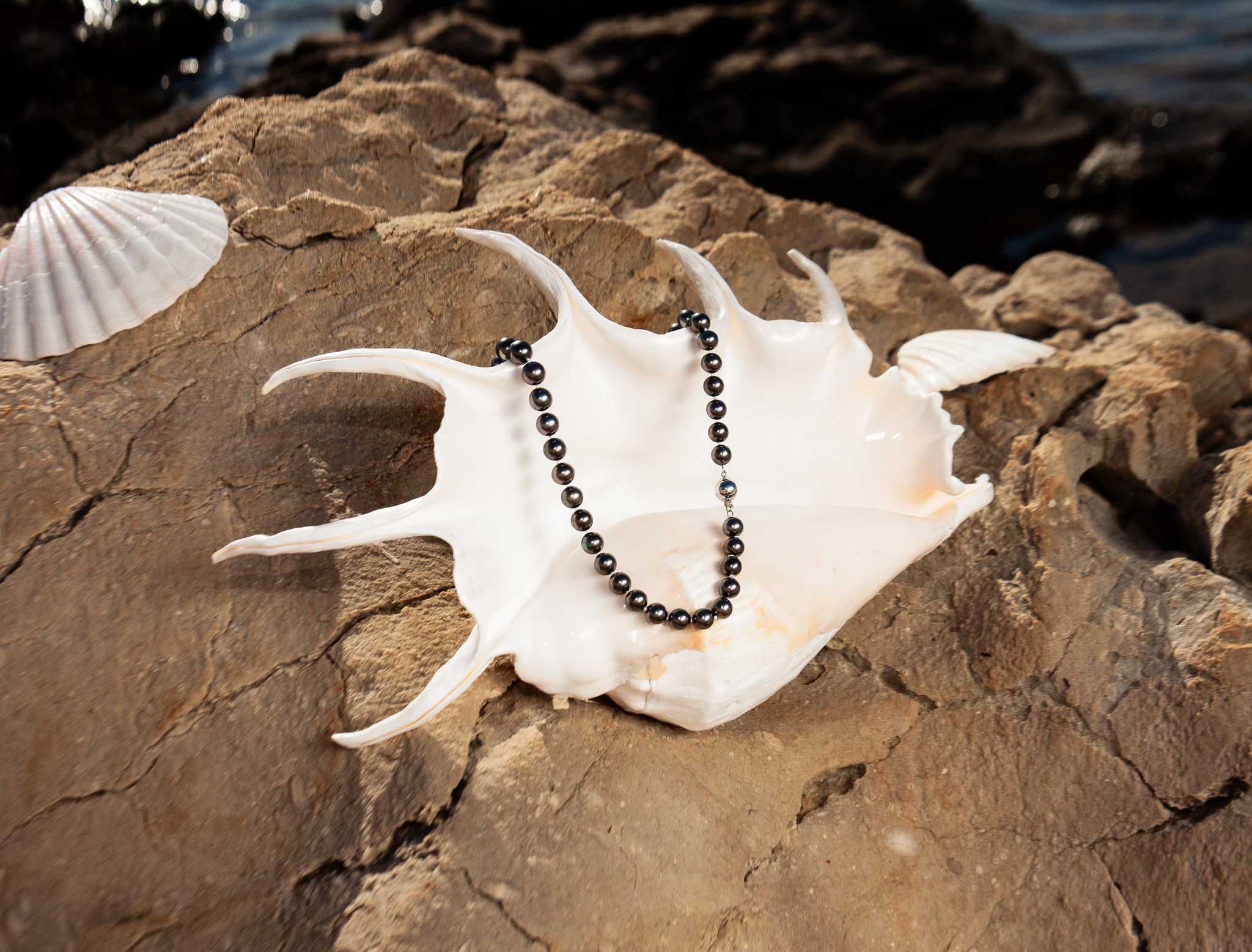 This exquisite 8-9mm Tahitian dark pearl necklace is a timeless piece of jewellery that embodies elegance, sophistication, and the natural beauty of the South Seas. Each pearl in this strand is a genuine cultured Tahitian pearl, renowned for its unique, naturally dark hues that range from deep charcoal to rich peacock green, with mesmerizing overtones of aubergine, silver, and blue. Carefully hand-selected for their round shape, smooth surface, and radiant luster, the pearls are graduated and skill-fully hand-knotted on durable silk thread to ensure longevity and elegance.