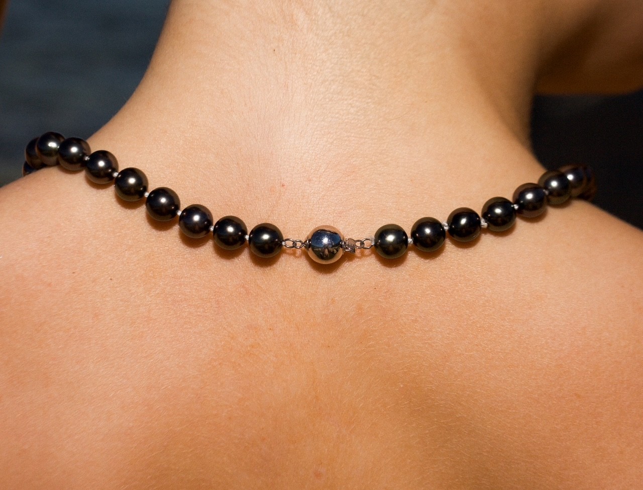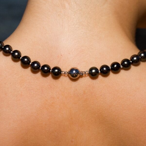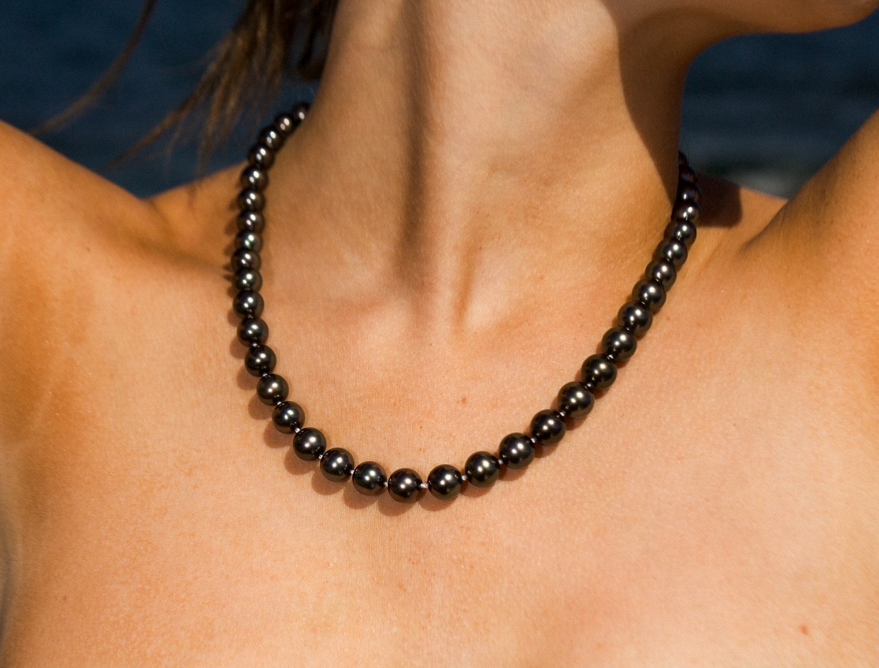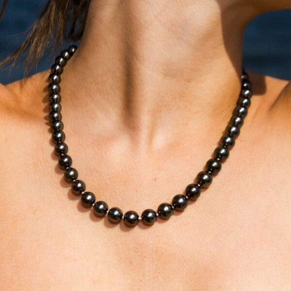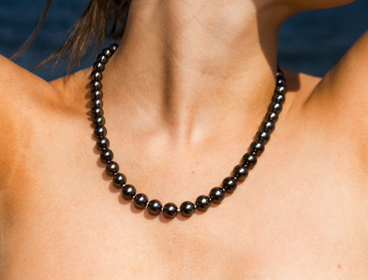 A Black Tahitian pearl necklace featuring 8-9mm pearls showcases naturally dark, lustrous pearls with rich overtones of green, purple, and silver. These cultured pearls, prized for their exotic beauty and smooth surface, are hand-knotted on silk and finished with a high-quality ball clasp, offering an elegant and timeless accessory.