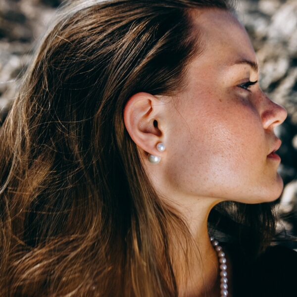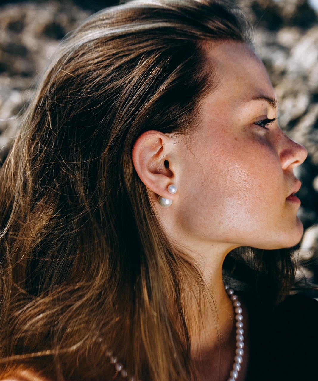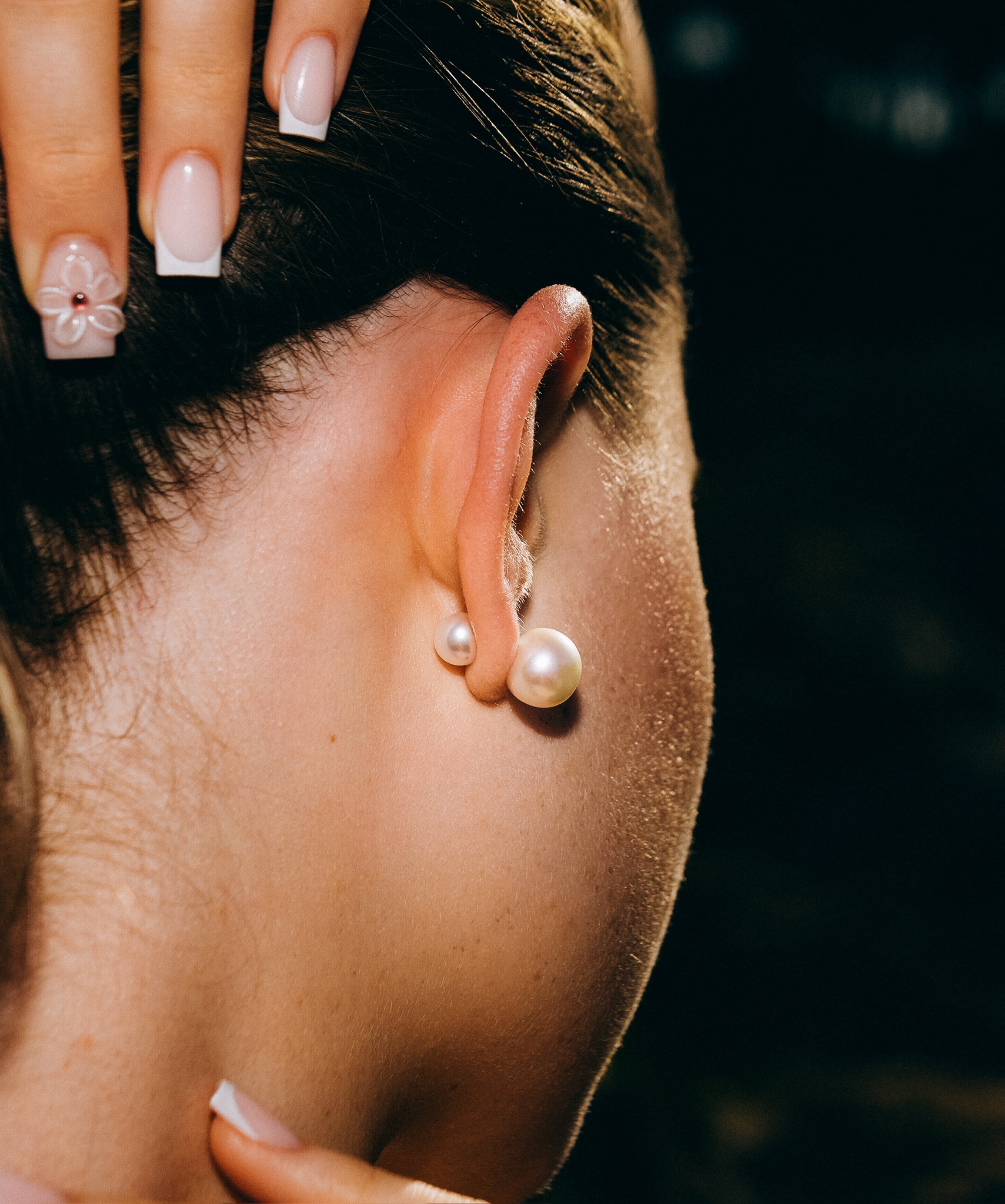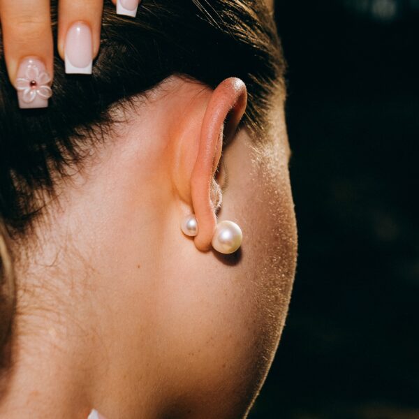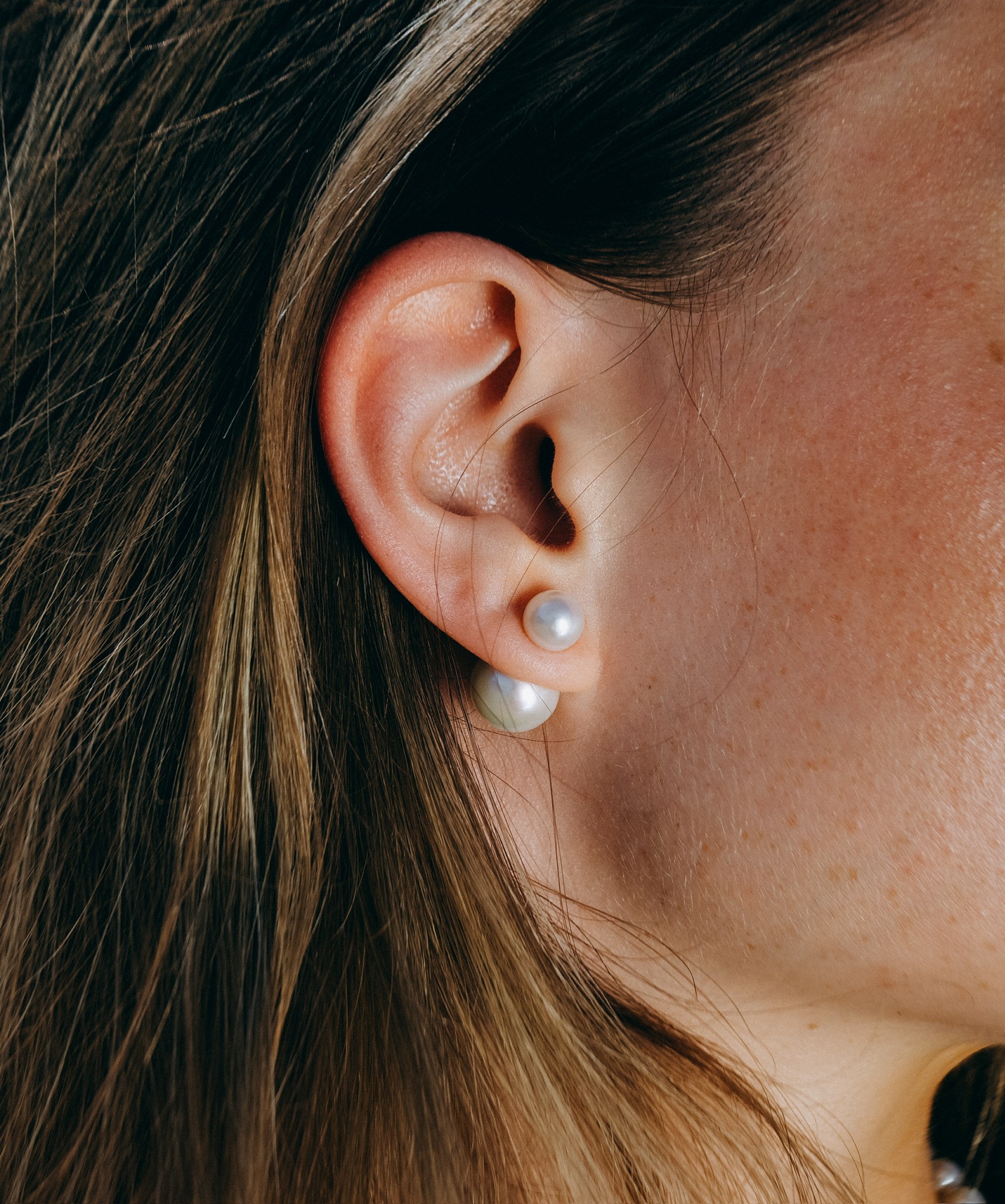 Chic and contemporary, these 8mm + 10mm white freshwater pearl earrings offer a fresh take on classic pearl jewellery. Each earring showcases a smaller 8mm pearl in front of the earlobe and a larger 10mm pearl behind, creating a double-sided design that’s both stylish and sophisticated.