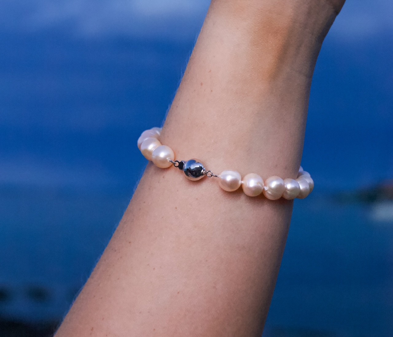Elegant and timeless, this 8mm freshwater pearl bracelet from our Wedding Collection features lustrous pearls in soft pink to peach hues. Finished with a sleek silver bead clasp, it adds a delicate, romantic touch—perfect for brides or bridesmaids.