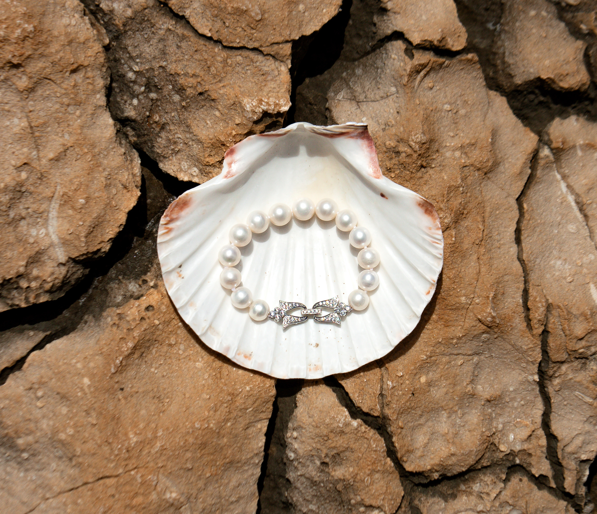 This 9–10mm white freshwater pearl bracelet features luminous, hand-selected pearls paired with a beautiful sparkling silver and zircon clasp. A timeless piece from our Wedding Collection, it adds refined elegance to any bridal look or special occasion.