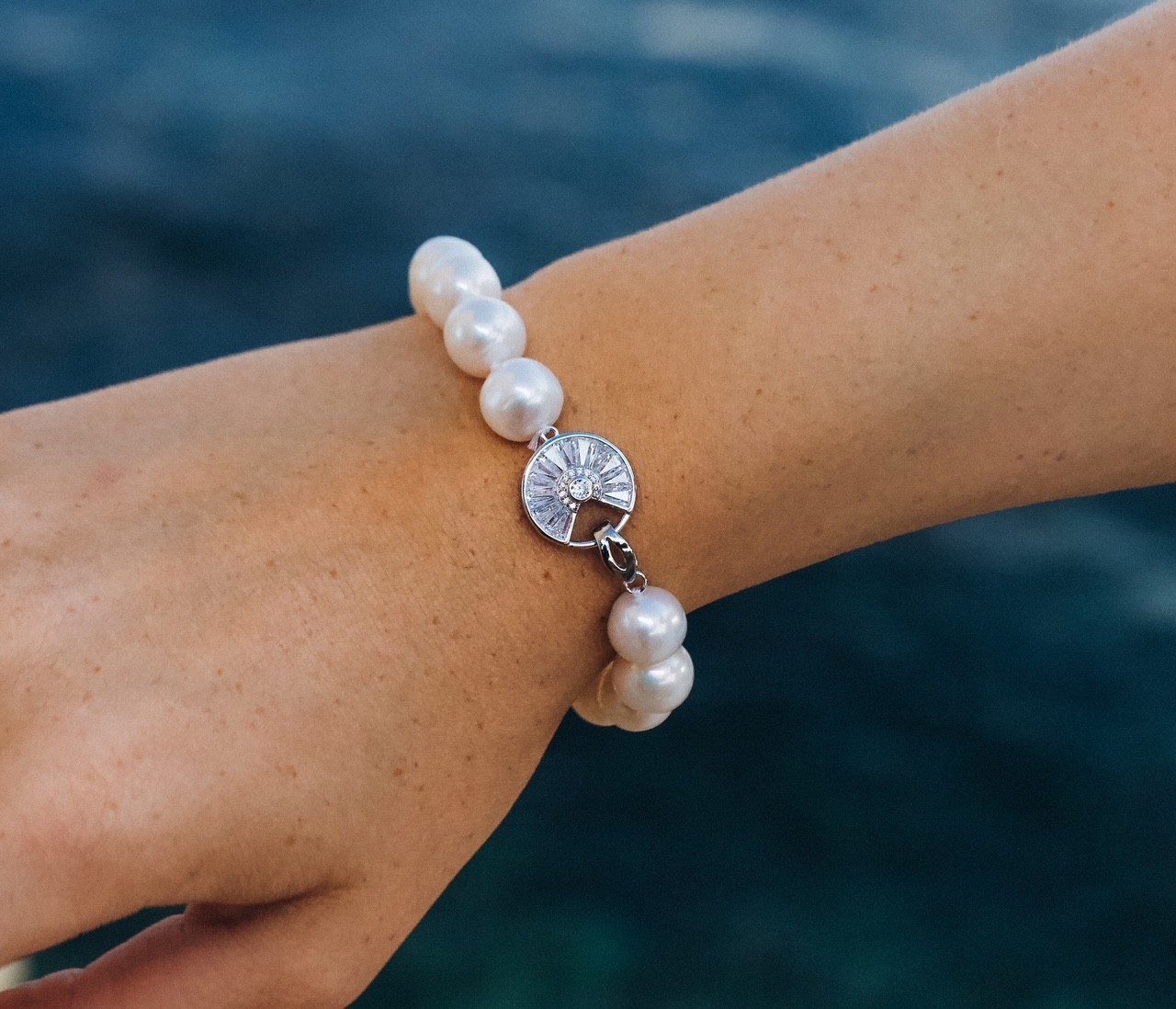 The bracelet is fastened with a luxurious silver clasp, meticulously crafted to provide both security and style. The clasp features a delicate arrangement of sparkling zirconia stones, adding an extra touch of brilliance that enhances the overall design. The subtle yet dazzling stones catch the light with every movement, creating a captivating contrast against the rich, luminous pearls.