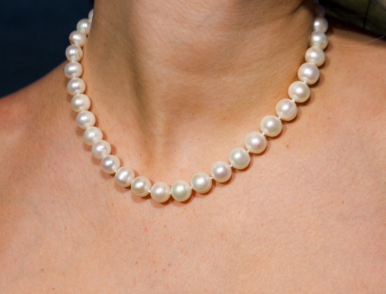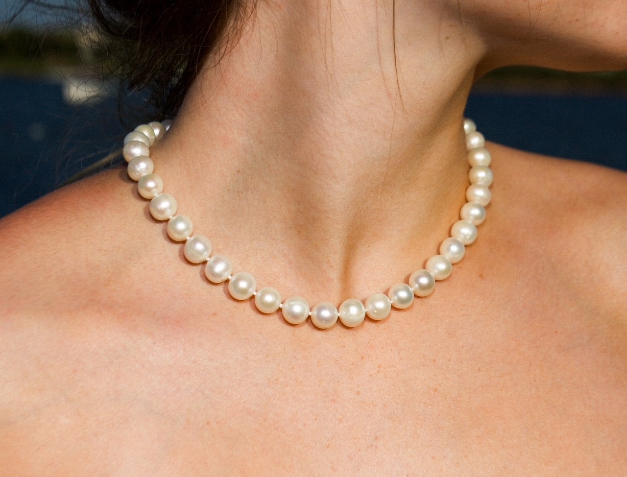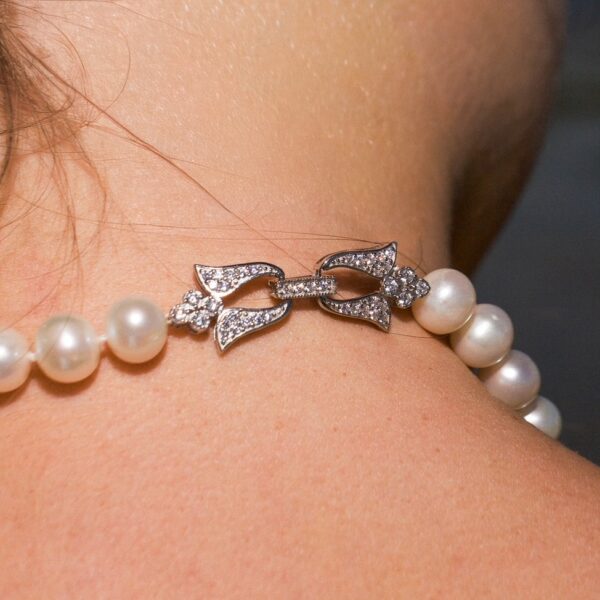This elegant necklace from our wedding collection features 9–10mm white freshwater pearls, hand-knotted for a refined finish. A stunning sterling silver clasp adorned with sparkling zircon adds the perfect touch of brilliance to this timeless bridal piece.