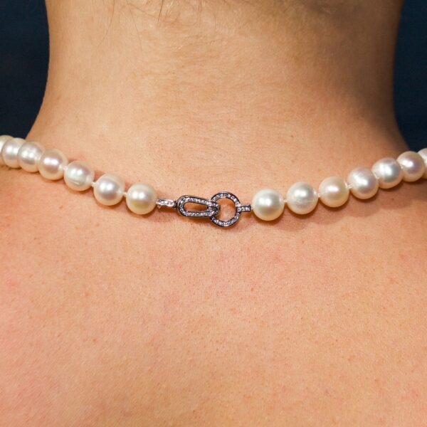 The necklace is finished with a beautifully crafted sterling silver clasp, adorned with shimmering zirconia stones. The clasp is more than just a closure—it’s a delicate detail that adds a hint of sparkle and modern refinement to this classic piece. Its secure design ensures the necklace stays comfortably in place while providing a luxurious finishing touch.