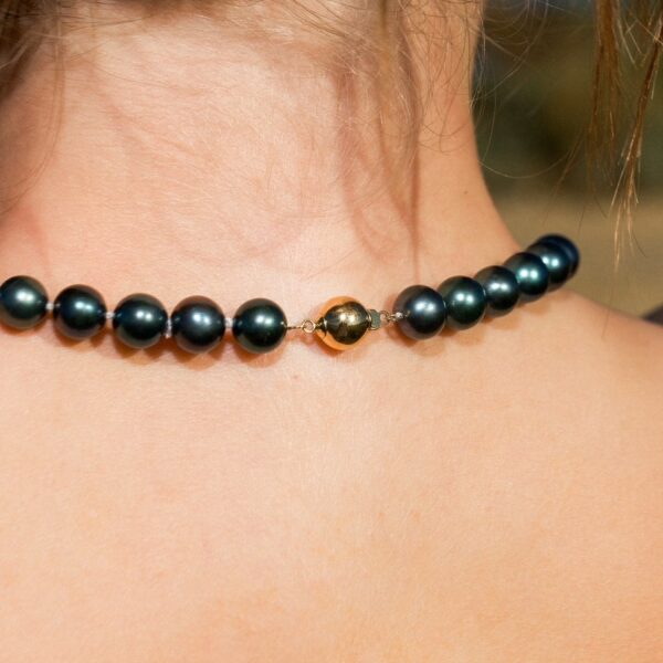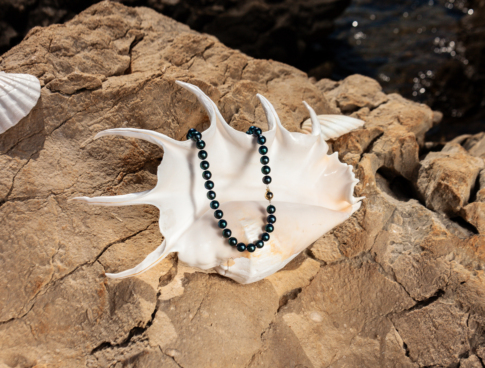 This striking necklace features 9–10mm round freshwater pearls with a rich dark green-blue, colour-enhanced metallic finish. Their high luster and iridescent tones create a bold, modern look with timeless elegance.