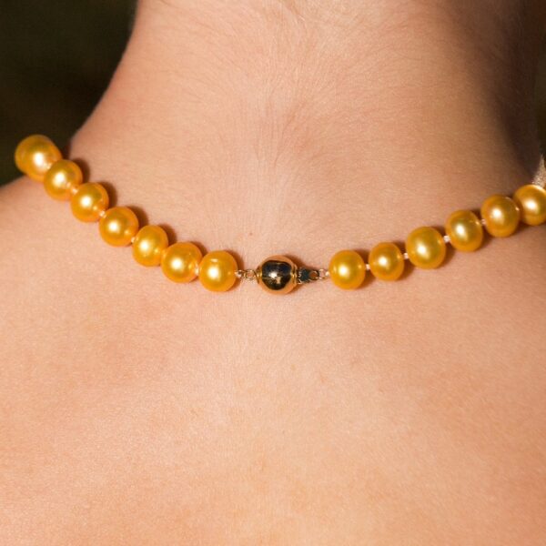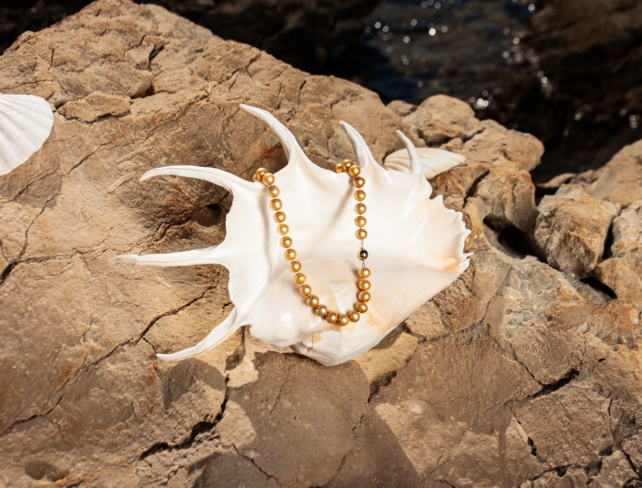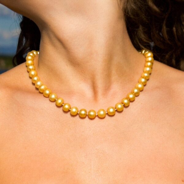 This radiant necklace features 9–10mm round freshwater pearls with a rich, golden colour-enhanced finish. Their high luster and warm glow make this a timeless and eye-catching piece, perfect for both everyday elegance and special occasions.
