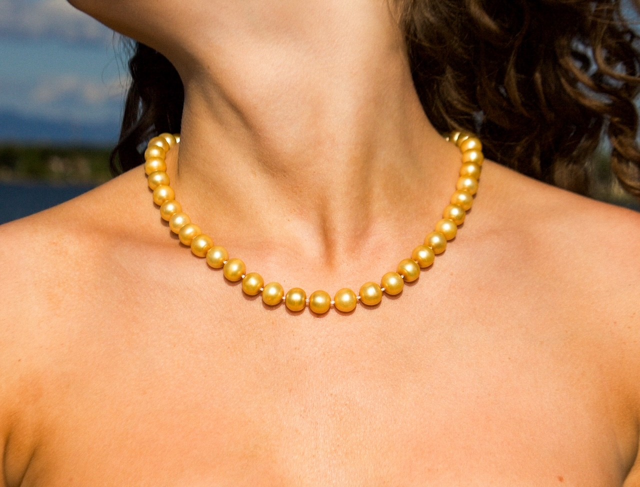 Radiating warmth and elegance, this 9–10mm golden freshwater pearl necklace is a bold and captivating statement of timeless beauty. Each pearl in this strand has been carefully colour-enhanced to achieve a rich, sunlit golden hue, reminiscent of the highly prized South Sea pearls. The result is a necklace that exudes luxury and sophistication—perfect for both formal and everyday wear.