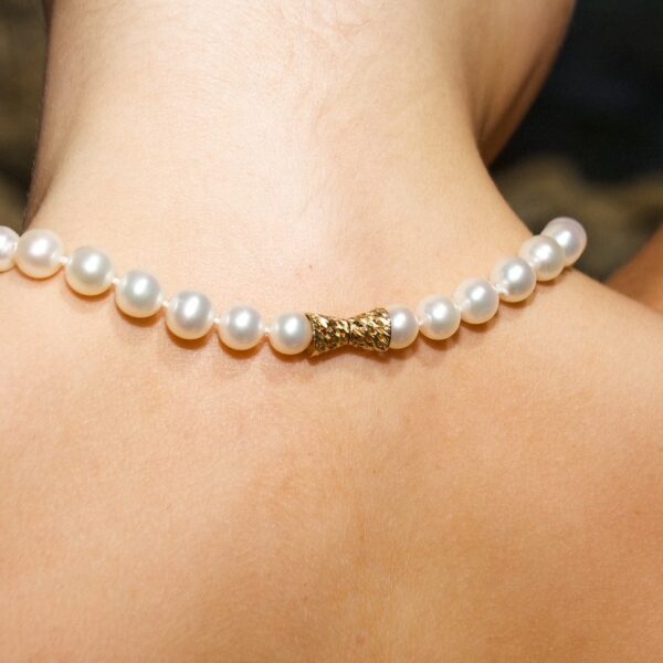 Each strand is hand-matched for size, tone, and symmetry, then individually hand-knotted on twin silk in our VILBORGOVA studio. The necklace is available in different lengths and finished with a solid 14 karat yellow gold tying bar clasp with a secure safety hook. As with all our strands, we’re happy to accommodate custom lengths upon request.