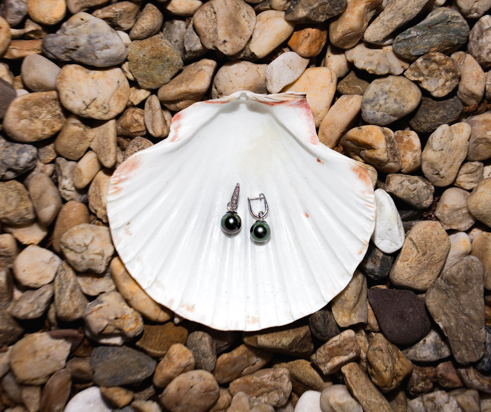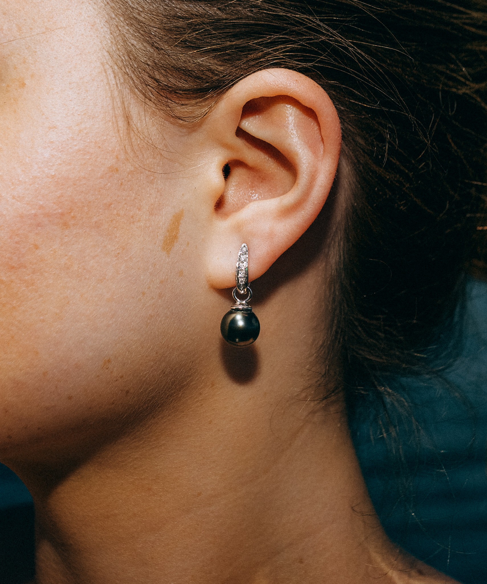 Suspended delicately from a refined loop-style earring setting, each piece is adorned with brilliant-cut white diamonds, expertly set in high-polish gold available in white or yellow gold or as an alternative Sterling Silver . The diamonds offer a radiant contrast to the deep, mysterious luster of the Tahitian pearls, catching the light with every movement and adding an extra layer of glamour to your look.