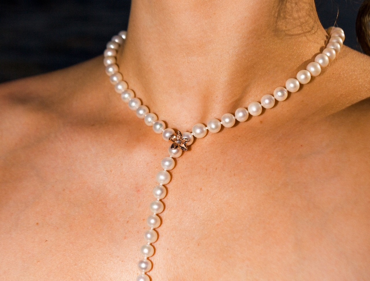 Elegant and refined, this white freshwater pearl necklace features a beautifully crafted Italian-made clasp in a delicate flower-like design, accented with a sparkling centre diamond. A timeless piece with a touch of romantic charm.