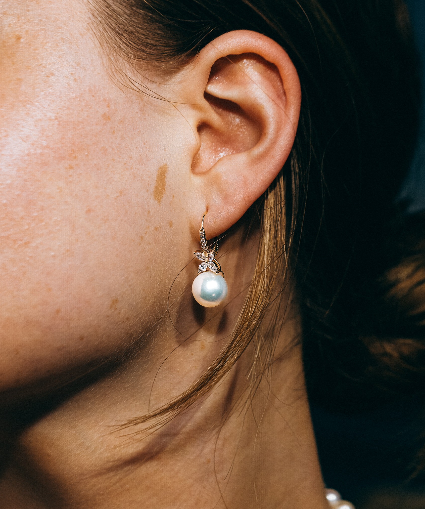 Adding a touch of sparkle, each earring is accented with brilliant-cut zircon stones. These dazzling gems are expertly faceted to capture and reflect light, offering a subtle shimmer that complements the velvety luster of the pearls. The harmonious combination of glowing pearls, radiant gold, and sparkling zircons creates a look that is both timeless and modern.